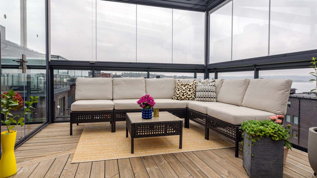When protected by balcony glazing, your balcony transforms from an occasionally usable space into one you can use almost any time. Our system is designed for maximum comfort and therefore easy to use. When the weather is cold, wet or windy, you can keep the balcony glazing closed for protection. When it’s warm and pleasant, you can open up the balcony glazing and let in fresh air. If the weather is somewhere in between, you can choose to have the balcony glazing partially open.